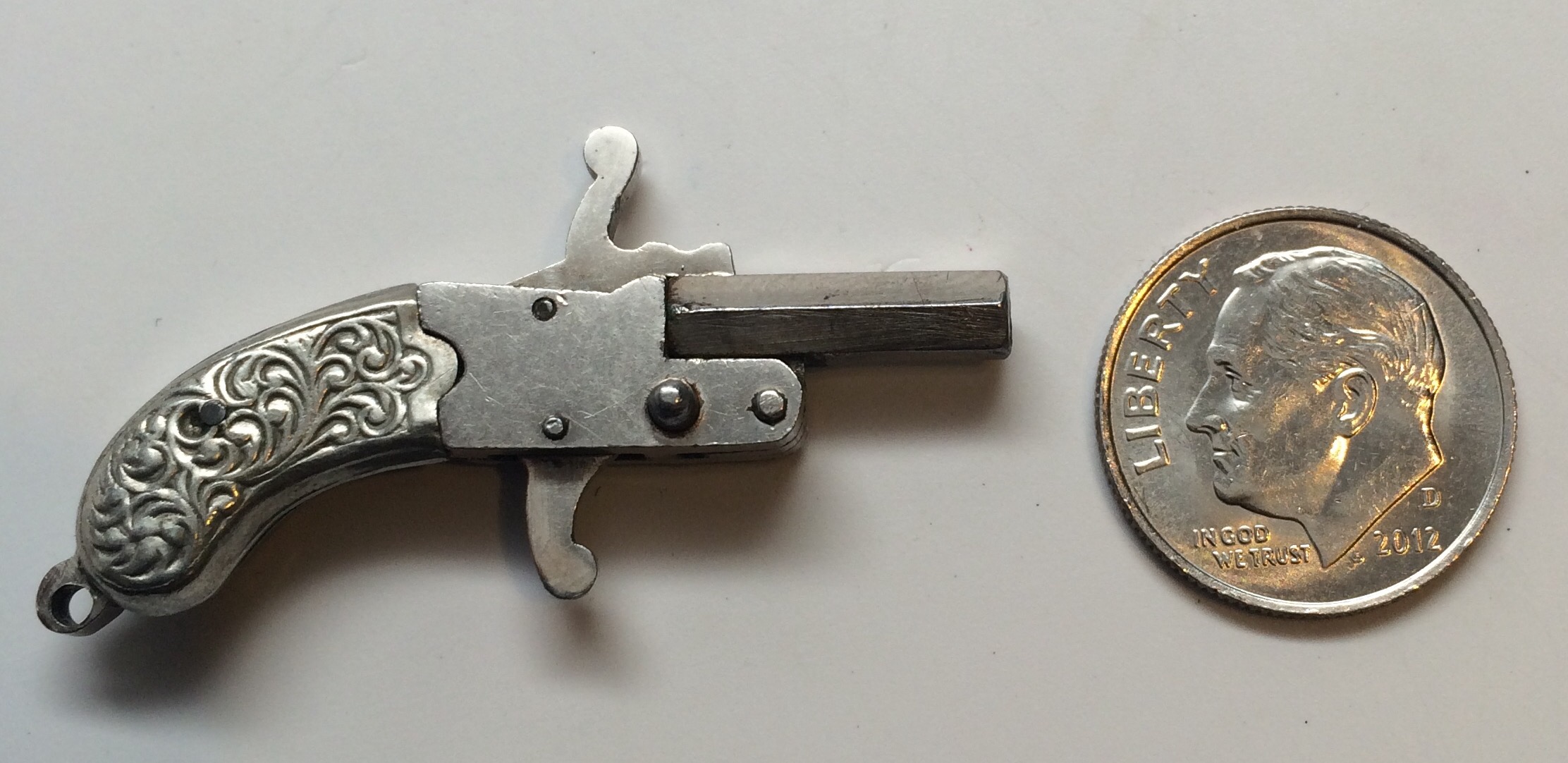 This is the Berloque miniature 2mm pinfire pistols from Austria - it is silver plated brass and has a round butt with florial designed, embossed grips. This is an antique, produced in the 1930's and are one of the later models, which has a round trigger & hammer. The barrel has a very clear stamp of AUSTRIA on the top. This particular model is in "A" or great condition (graded based on the overall working condition and aesthetics for the same style and age). This gun has a nice finish, with just some minor scratches, tarnish and wear on the gun's body. The trigger is nice and stiff, and the overall length (OAL) is 1 5/8". These minis are designed to fire ANY projectiles. Be cautious when loading and firing this gun with projectiles such as lead balls and caps.