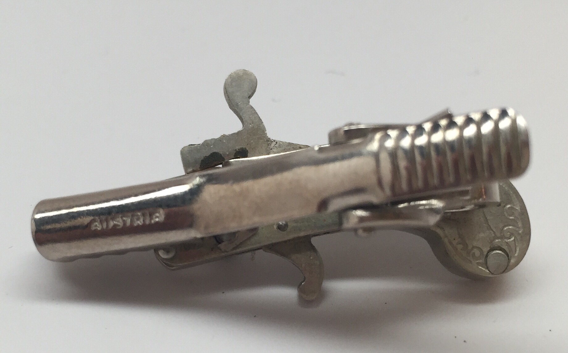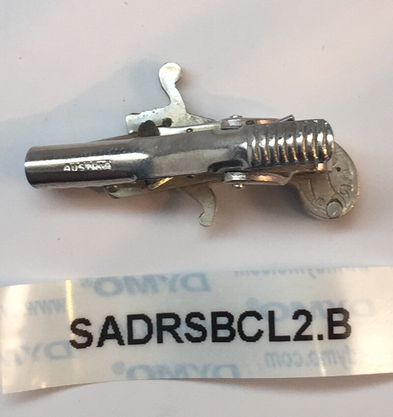 This is a Berloque miniature 2mm pinfire pistol from Austria - it is nickel-plated and has a square butt with deer and rabbit grips. It is a tie clip combo that can be used as an accessory or put on clothing. Its also an antique, produced in the 1950's and is one of the later models: which has a solid barrel, rounded happer and rounded trigger. This particular model is in "B" or good condition (graded based on the overall working condition and aesthetics for the same style and age). This gun has a nice finish, with just minor tarnish. The trigger is nice also and the OAL is 1 7/6". Comes with black case you see here. This mini is designed ONLY to fire 2mm pinfire BLANKS, due to having a VENTED* barrel, which is CLOSED/SEALED at the end and therefore can not fire any projectiles.