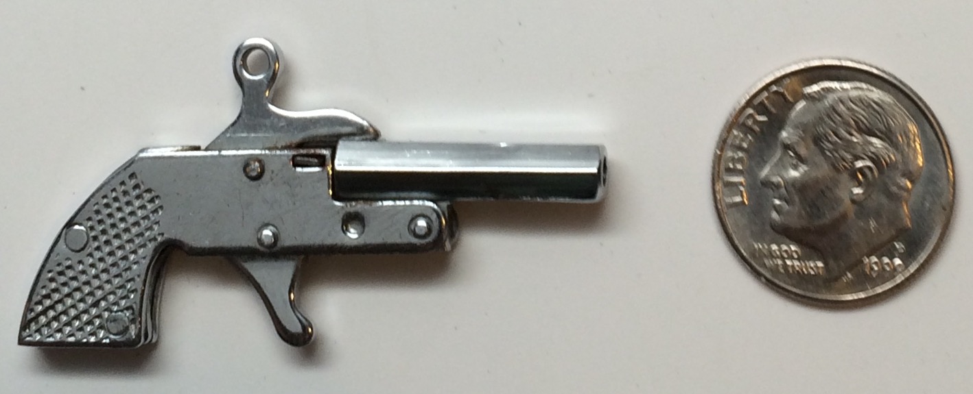 This is the Little Atom Berloque miniature 2mm pinfire pistol from Japan - it is nickel-plated brass, has a sqaure butt with checkered grips and a hammer hole. There is also a clear stamp of "JAPAN" underneath the barrel on the left side of the gun. The similar Austrian version does not have the beaded background, and the grips are pressed relief and removable from the guns. This is an antique, produced in the 1930's-1950's and are one of the later models, which has a round trigger & hammer. The barrel is also vented. This particular model is in "A" or great condition (graded based on the overall working condition and aesthetics for the same style and age). This gun has a good finish, with just minor tarnish, scratches and wear on the gun - mainly the hammer and body. The trigger works fine and the overall length (OAL) is 1 5/8". These minis are designed to fire ONLY BLANK projectiles. Be cautious when loading and firing this gun regardless!