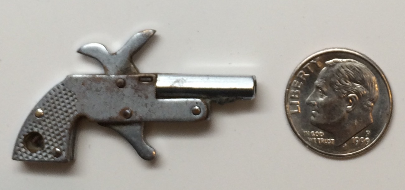 This is the Little Atom Berloque miniature 2mm pinfire pistol from Japan - it is nickel-plated brass, has a sqaure butt with checkered grips and a sharp hammer - making it rare and harder to find! There is also a clear stamp of "JAPAN" underneath the barrel on the left side of the gun. The similar Austrian version does not have the beaded background, and the grips are pressed relief and removable from the guns. The barrel is also vented, meaning that (if it were in working condition) it would only be able to fire 2mm Pinfire Blanks. This particular model is graded as "F" or poor condition and this gun does not fire. This gun has a poor finish, with tarnish, scratches and wear on the gun - mainly the hammer and body. Also it has a hole on the gun's grips. The trigger does not fire or the hammer cock back and the overall length (OAL) is 1 5/8". These minis are designed to fire ONLY BLANK projectiles. Be cautious when loading and firing this gun regardless!
