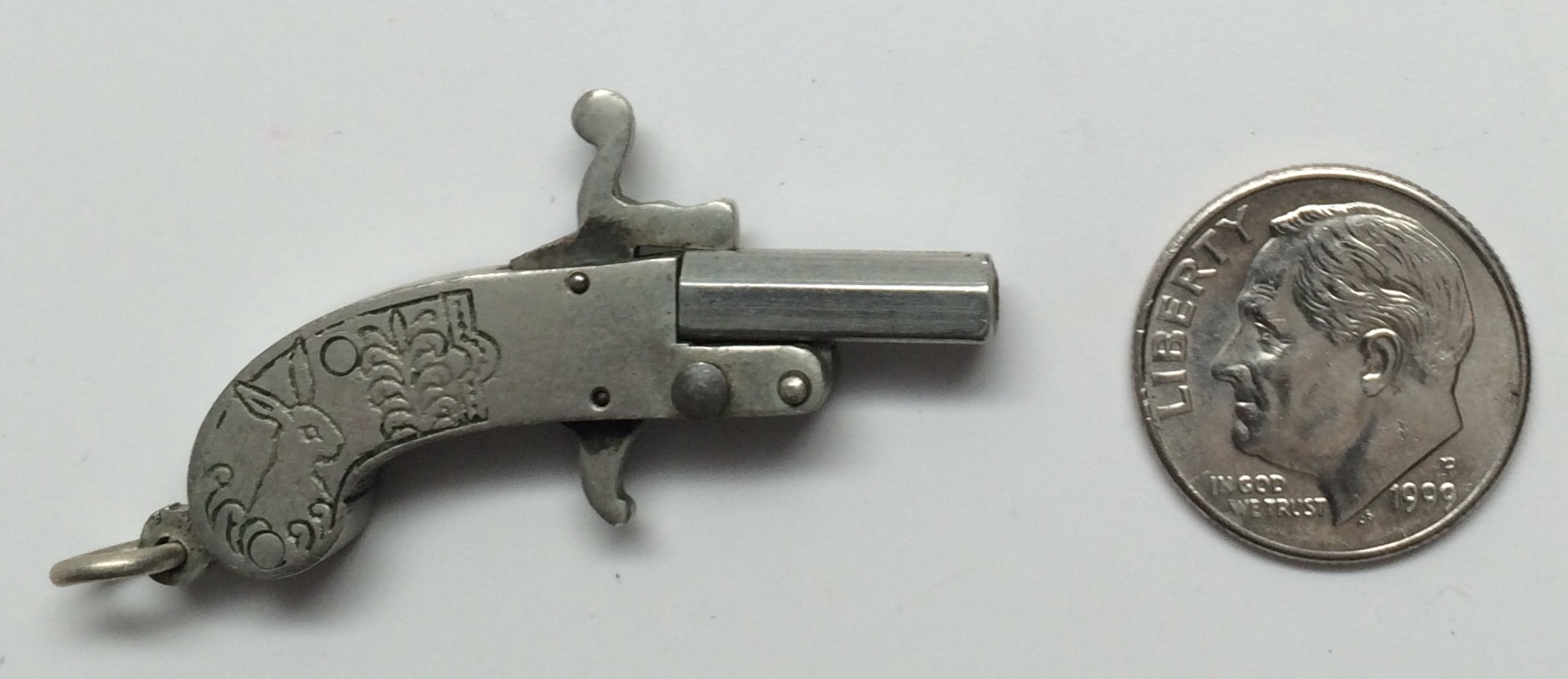 This is the Berloque miniature 2mm pinfire pistols from Austria - it is silver-plated brass, has a short barrel, and has a round butt with florial designed, embossed grips. This is an antique, produced in the 1930's and are one of the later models, which has a round trigger & hammer. This particular model is in "A" or great condition (graded based on the overall working condition and aesthetics for the same style and age). This gun has a nice finish, with just some minor pitting, tarnish and wear on the left side of the gun's body and also the hammer. The trigger works well and the overall length (OAL) is 1 5/8". These minis are designed to fire ANY projectiles. Be cautious when loading and firing this gun with projectiles such as lead balls and caps.